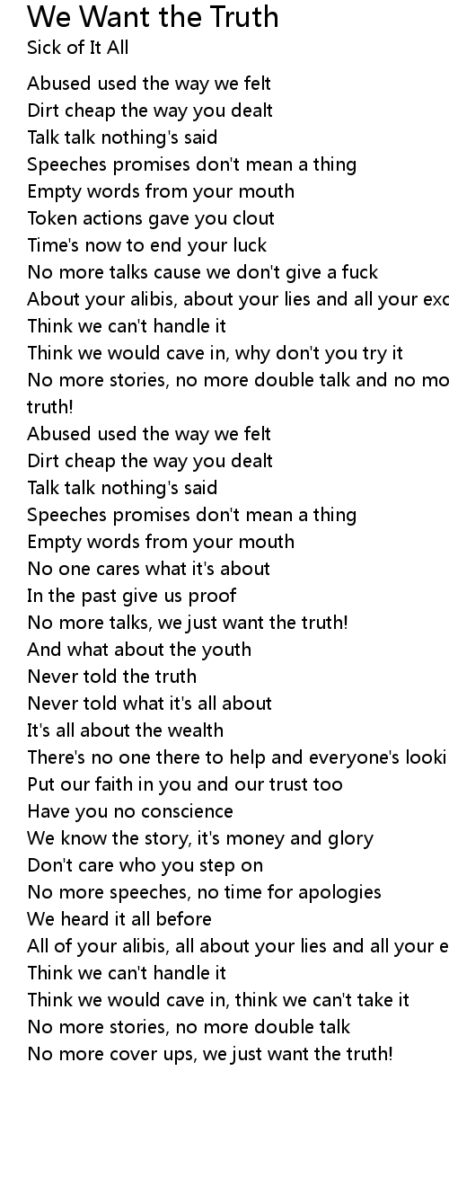 No more stories, no more double talk and no more cover ups, we just want the truth! |
