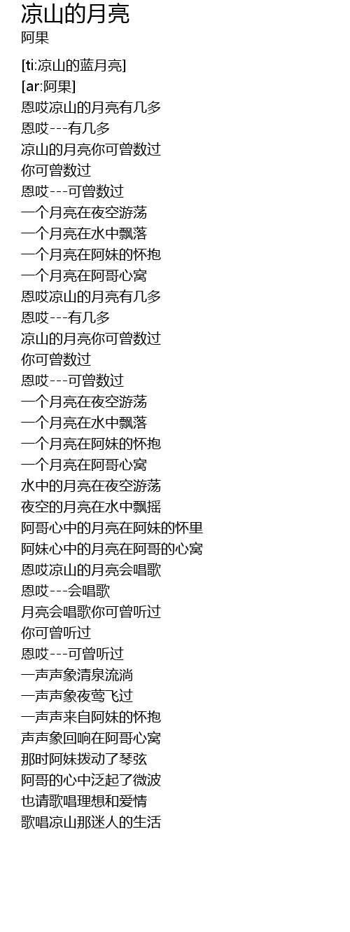 | [00:36.470] | 恩哎凉山的月亮有几多 |