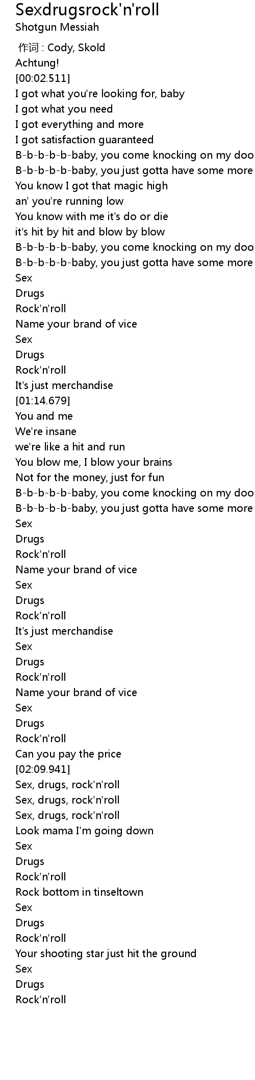 | [02:59.434] | Sex, drugs, rock' n' roll |