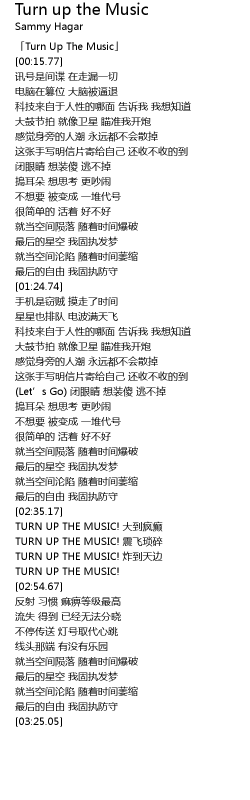 | [02:41.78] | TURN UP THE MUSIC! dà dào fēng diān |