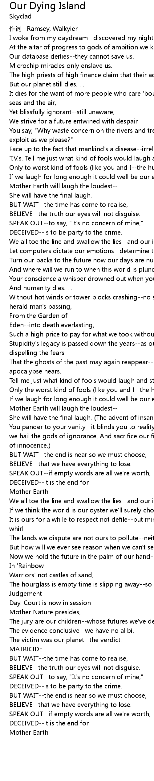 | It dies for the want of more people who care 'bout the poisons we pump in the seas and the air, | |