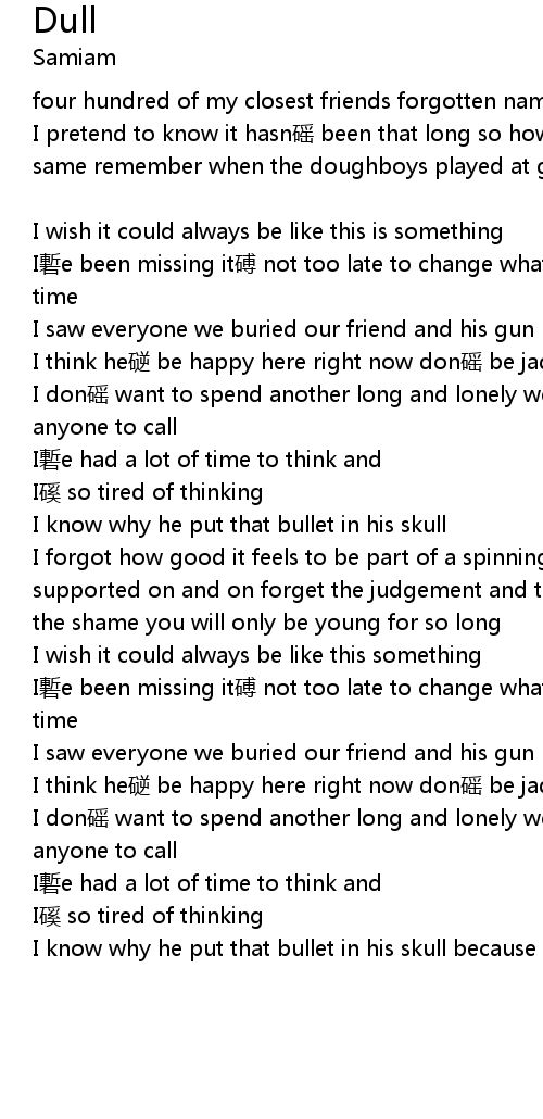 | I pretend to know it hasn qing been that long so how you chan e been you look the same remember when the doughboys played at gilman and they broke up on your lawn | |