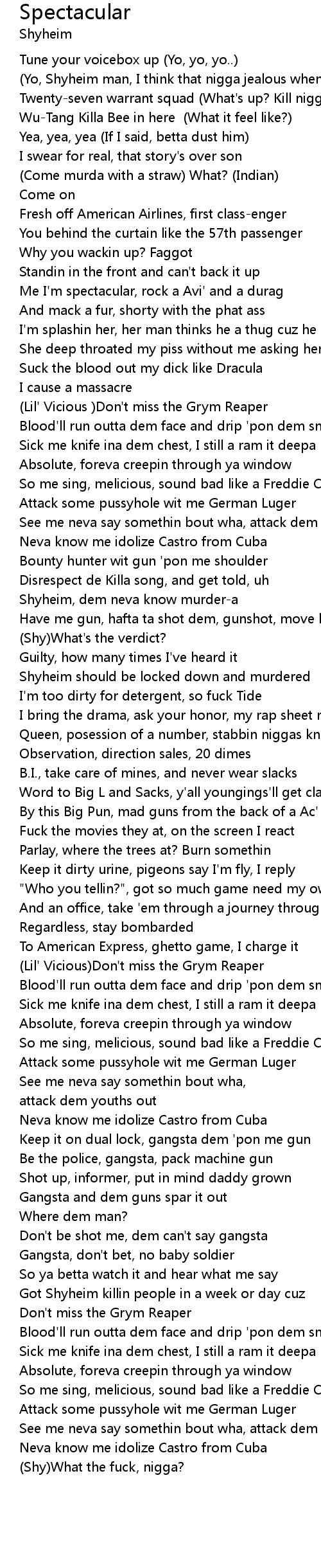 | [02:04.158] | Blood'll run outta dem face and drip 'pon dem sneakas |