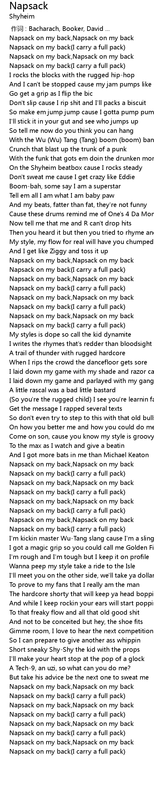 | [02:23.94] | Napsack on my back,Napsack on my back |