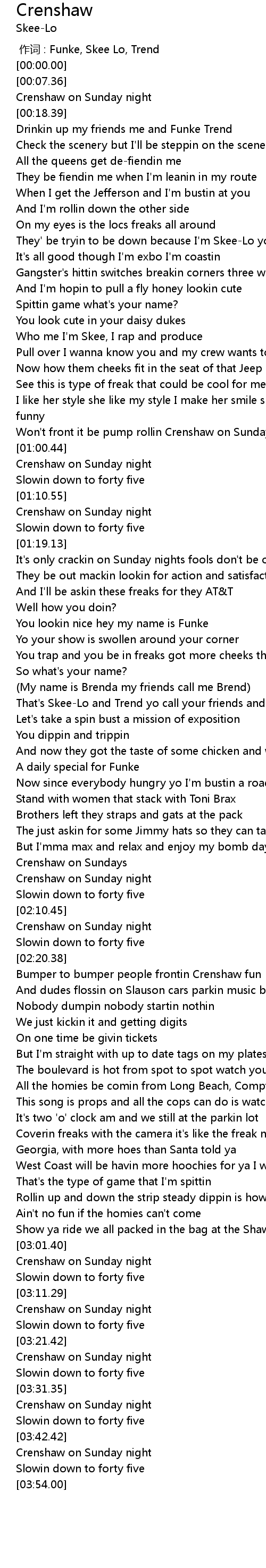 | [00:58.15] | Won' t front it be pump rollin Crenshaw on Sunday |
