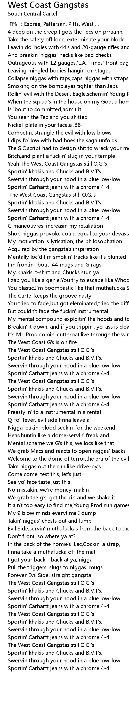 | [00:54.43] | Yeah The West Coast Gangstas still O. G.' s |