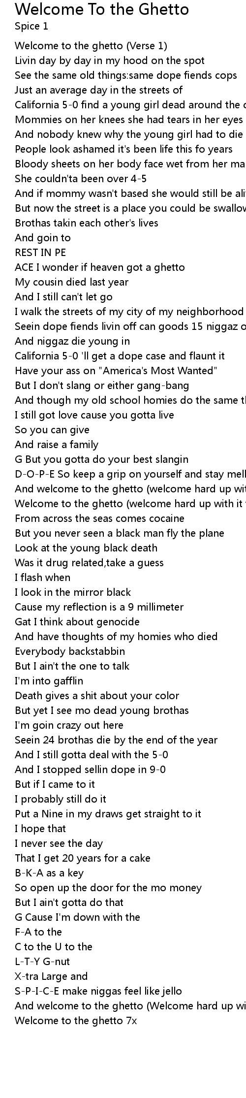 | Welcome to the ghetto (welcome hard up with it to my life) (Verse 2) | |