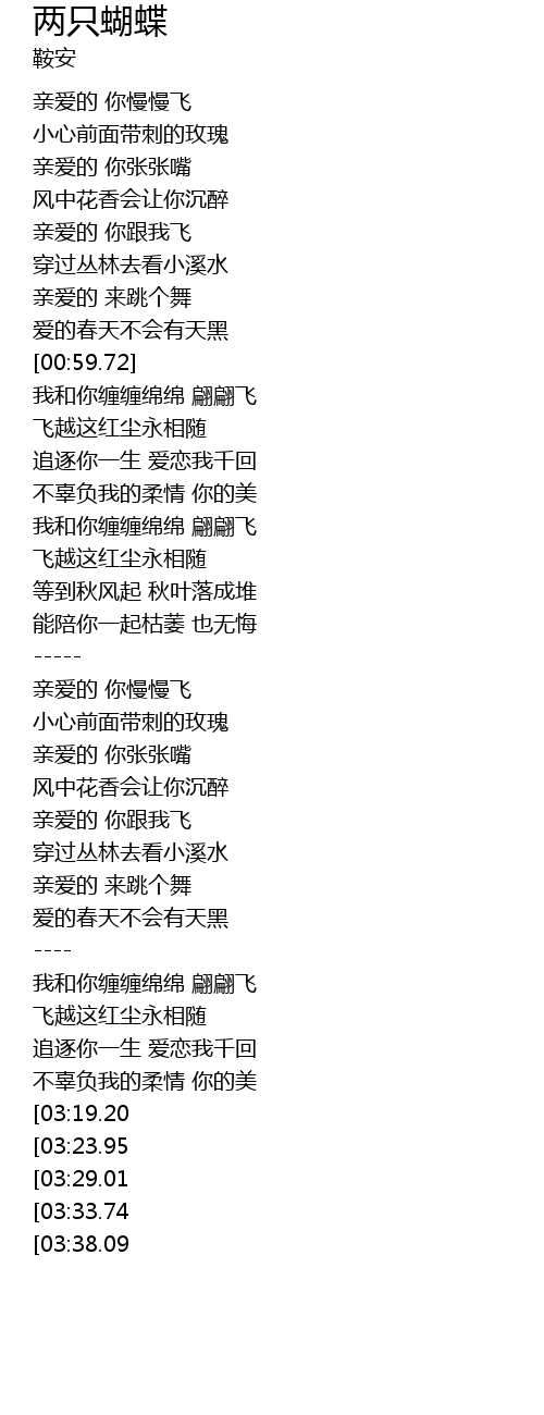 | [03:38.91][03:19.20][02:59.66] | 我和你缠缠绵绵 翩翩飞 |