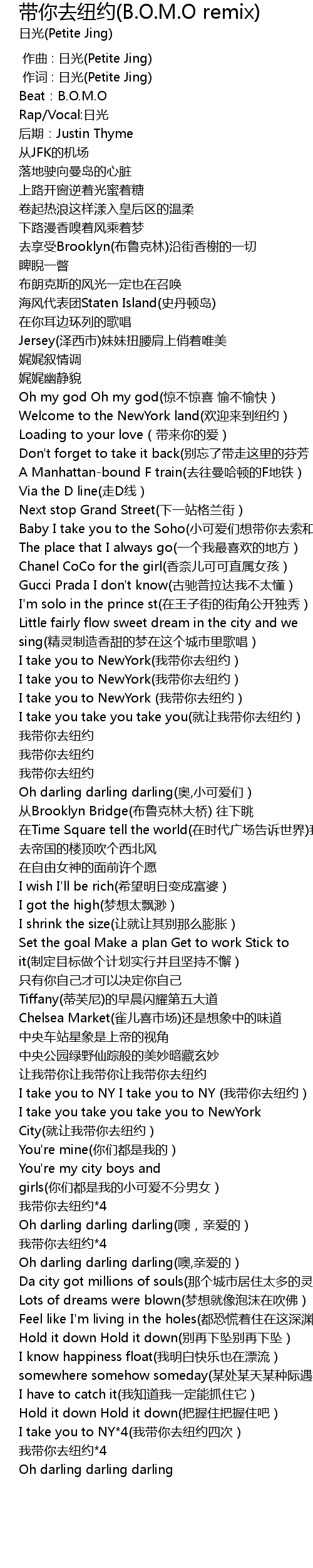 | [02:02.742] | I take you to NY I take you to NY wo dai ni qu niu yue |