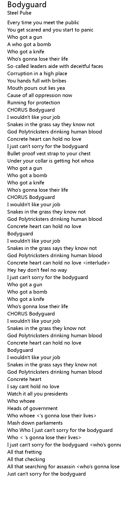 I just can't sorry for the bodyguard <who's gonna lose their lives> |