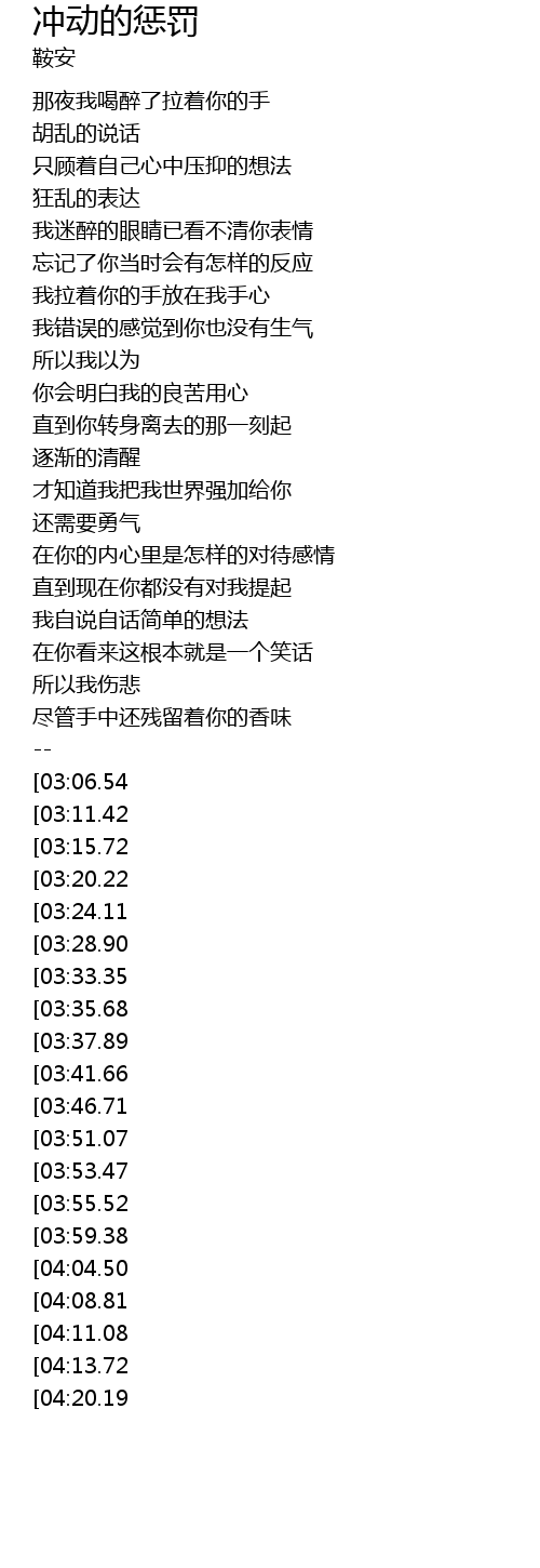 | [02:57.39][04:13.72] | 这是对冲动最好的惩罚 |