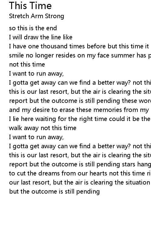 I gotta get away can we find a better way? not this time right now, right here this is our last resort, but the air is clearing the situation is too tough to report but the outcome is still pending stars hang like daggers waiting to fall to cut the dreams from our hearts not this time right now, right here this is our last resort, but the air is clearing the situation is too tough to report but the outcome is still pending |