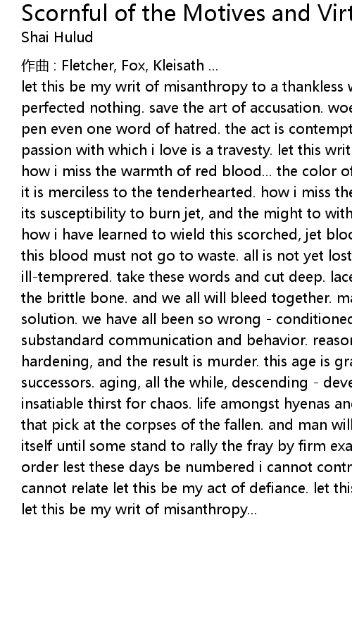 | let this be my writ of misanthropy to a thankless world of men who have perfected nothing. save the art of accusation. woe is he that feels compelled to pen even one word of hatred. the act is contemptible. to know i hate with the passion with which i love is a travesty. let this writ acknowledge these facts. how i miss the warmth of red blood... the color of pitch is cold and hard, and it is merciless to the tenderhearted. how i miss the strength of red blood... its susceptibility to burn jet, and the might to withstand a brutal scorching. how i have learned to wield this scorched, jet blood to the gross advantage... this blood must not go to waste. all is not yet lost. take these words of blood ill-temprered. take these words and cut deep. lacerate the soiled flesh. impact the brittle bone. and we all will bleed together. may this blood pave the way to solution. we have all been so wrong - conditioned to accept and approve of substandard communication and behavior. reason is clouding, hearts are hardening, and the result is murder. this age is grave bound, likewise its aging successors. aging, all the while, descending - developing an even more insatiable thirst for chaos. life amongst hyenas and asps under the vultures that pick at the corpses of the fallen. and man will continue to suffer unto itself until some stand to rally the fray by firm example chaos must succumb to order lest these days be numbered i cannot contribute to disarray i simply cannot relate let this be my act of defiance. let this be my refusal to fit in let this be my writ of misanthropy... |