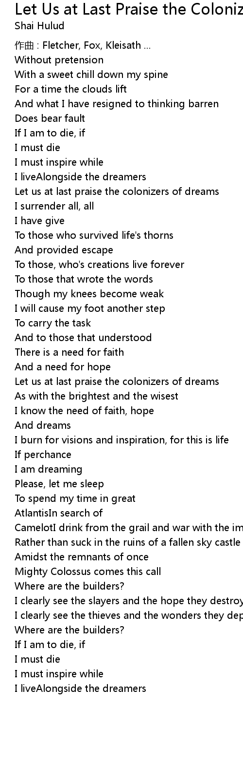 | Song | Let Us at Last Praise the Colonizers of Dreams |