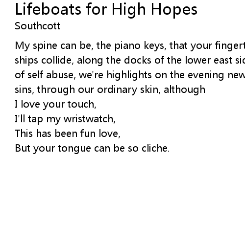 | My spine can be, the piano keys, that your fingertips play, wide eyed as the ships collide, along the docks of the lower east side, and we're on this cruise, of self abuse, we're highlights on the evening news, and we're sweating out our sins, through our ordinary skin, although | |