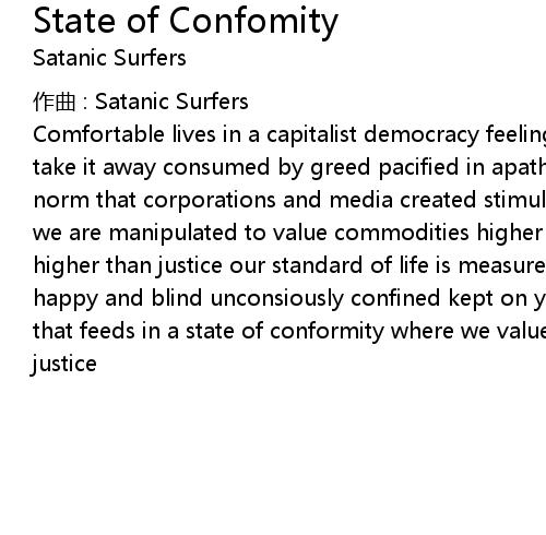| Comfortable lives in a capitalist democracy feeling safe and secure until they take it away consumed by greed pacified in apathy were disinformed to fit the norm that corporations and media created stimulated but constantly unsatisfied we are manipulated to value commodities higher than justice higher than equality higher than justice our standard of life is measured by what we own subdued kept happy and blind unconsiously confined kept on your knees no one bites the hand that feeds in a state of conformity where we value commodities higher than justice |