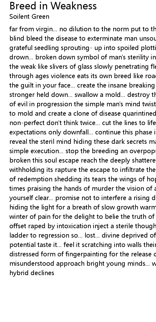 far from virgin... no dilution to the norm put to the test... walking with the blind bleed the disease to exterminate man unsound knowledge for the less grateful seedling sprouting- up into spoiled plotting harsh on the plagued... drown... broken down symbol of man's sterility in a broken glass shattered are the weak like slivers of glass slowly penetrating flesh sin bleeds its stain through ages violence eats its own breed like roaches in enormous hordes smear the guilt in your face... create the insane breaking down... immune... making stronger held down... swallow a mold... destroy the genetic code steal the mind of evil in progression the simple man's mind twisted and warped to lead a world to mold and create a clone of disease quarintined in idealist form of the non-perfect don't think twice... cut the lines to life reactions in hand vital expectations only downfall... continue this phase i've seen the faces melt... reveal the steril mind hiding these dark secrets man tries to leave behind simple execution... stop the breeding an overpopulation of fools teach the broken this soul escape reach the deeply shattered the spreading colonies... withholding its rapture the escape to infiltrate the plagued sky opens its eyes of redemption shedding its tears the wings of hope... singed and burned too many times praising the hands of murder the vision of a man's dream diseased stear yourself clear... promise not to interfere a rising downfall... drunk and raped hiding the light for a breath of slow growth warmth bearing the birth of death a winter of pain for the delight to belie the truth of man... this unbalanced offset raped by intoxication inject a sterile thought with an infection now the ladder to regression so... lost... divine deprived of the innocent producing potential taste it... feel it scratching into walls their form of art a distressed form of fingerpainting for the release of pain ignorant knowledge misunderstood approach bright young minds... weak lost minds lose the edge... hybrid declines |