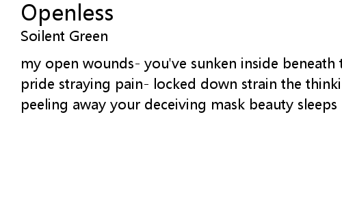 | my open wounds- you've sunken inside beneath the layers to kill my lonesome pride straying pain- locked down strain the thinking game give and get fucked peeling away your deceiving mask beauty sleeps inside |