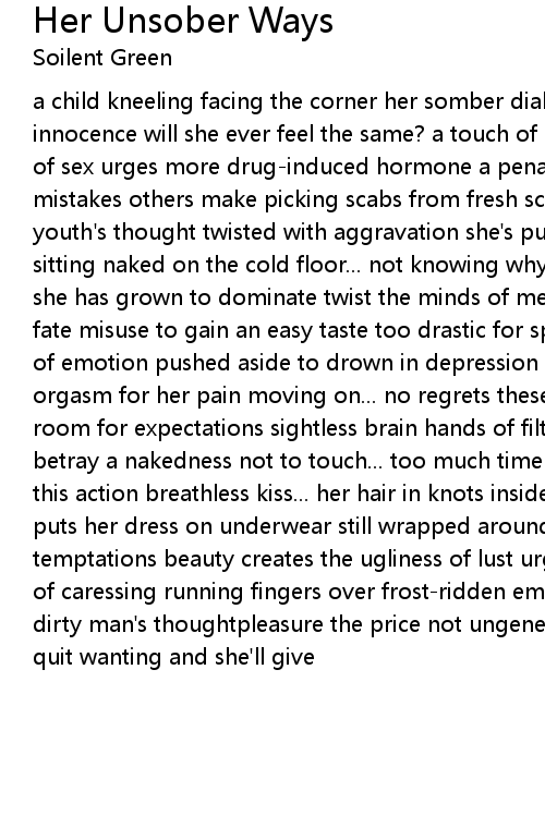 a child kneeling facing the corner her somber dialect exposed a rape enclosed innocence will she ever feel the same? a touch of battery and deviance the sweat of sex urges more drug-induced hormone a penalty stupid mistakes made- ignorant mistakes others make picking scabs from fresh scars making newer pain this youth's thought twisted with aggravation she's punished... they're to blame sitting naked on the cold floor... not knowing why hold her hand through rape she has grown to dominate twist the minds of men leeching off other's unjest fate misuse to gain an easy taste too drastic for space to conceive tendencies of emotion pushed aside to drown in depression circle lapping in here head orgasm for her pain moving on... no regrets these promises she can't keep no room for expectations sightless brain hands of filth disobey... actions that betray a nakedness not to touch... too much time for her uncivilized compromise this action breathless kiss... her hair in knots inside-out and backwards she puts her dress on underwear still wrapped around her legs weakness overridden by temptations beauty creates the ugliness of lust urge of rejection i n patterns of caressing running fingers over frost-ridden emotion this blocked-out... a dirty man's thoughtpleasure the price not ungenerous... being asked she resents quit wanting and she'll give