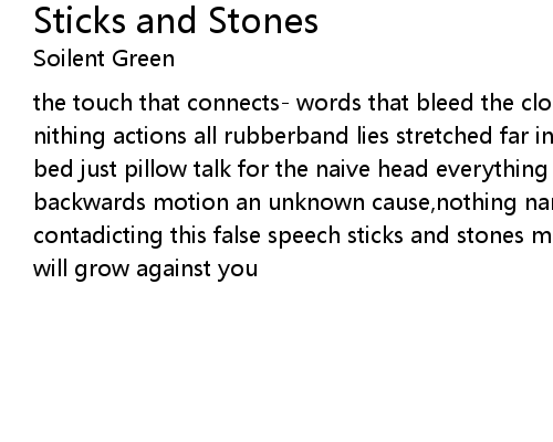 | the touch that connects- words that bleed the closeness that rejects- words mean nithing actions all rubberband lies stretched far intimate words spoken while in bed just pillow talk for the naive head everything in names ideas prone to a backwards motion an unknown cause,nothing named a thought people state- contadicting this false speech sticks and stones made of syllables these words will grow against you |