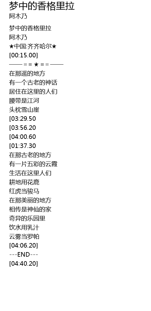 | [04:15.70][04:00.60][03:42.90][02:38.30][01:31.70] | 梦中的香格里拉 |