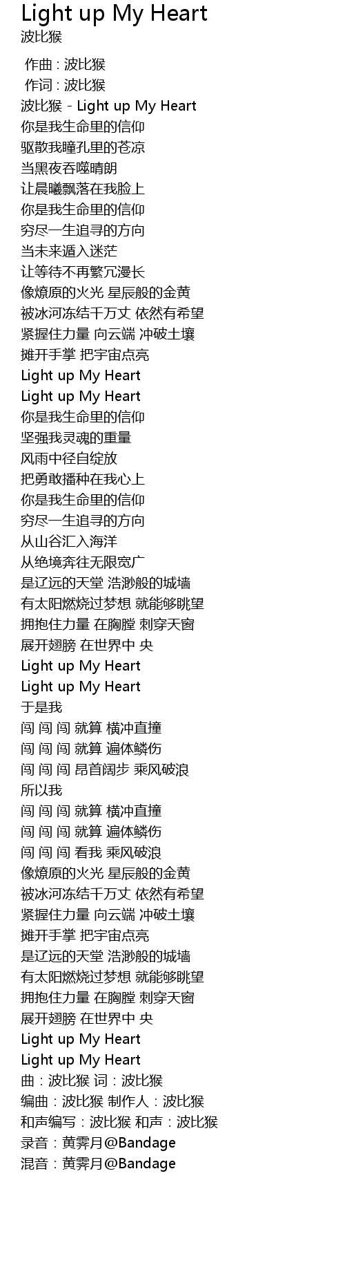 | [00:01.272] | bō bǐ hóu Light up My Heart |