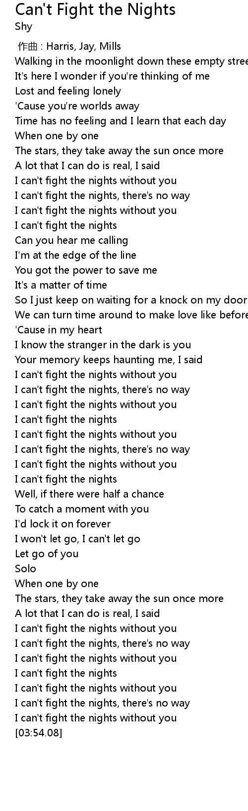 | [02:04.02] | I can' t fight the nights, there' s no way |