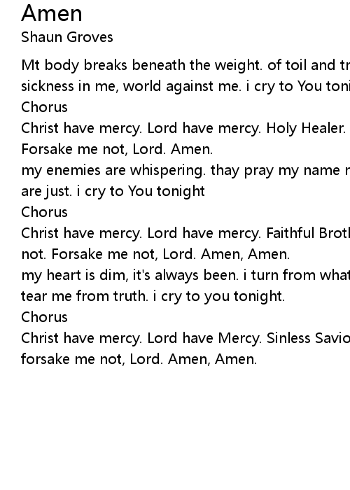 Christ have mercy. Lord have Mercy. Sinless Savior. Judge of Men. Pass me not. forsake me not, Lord. Amen, Amen. |