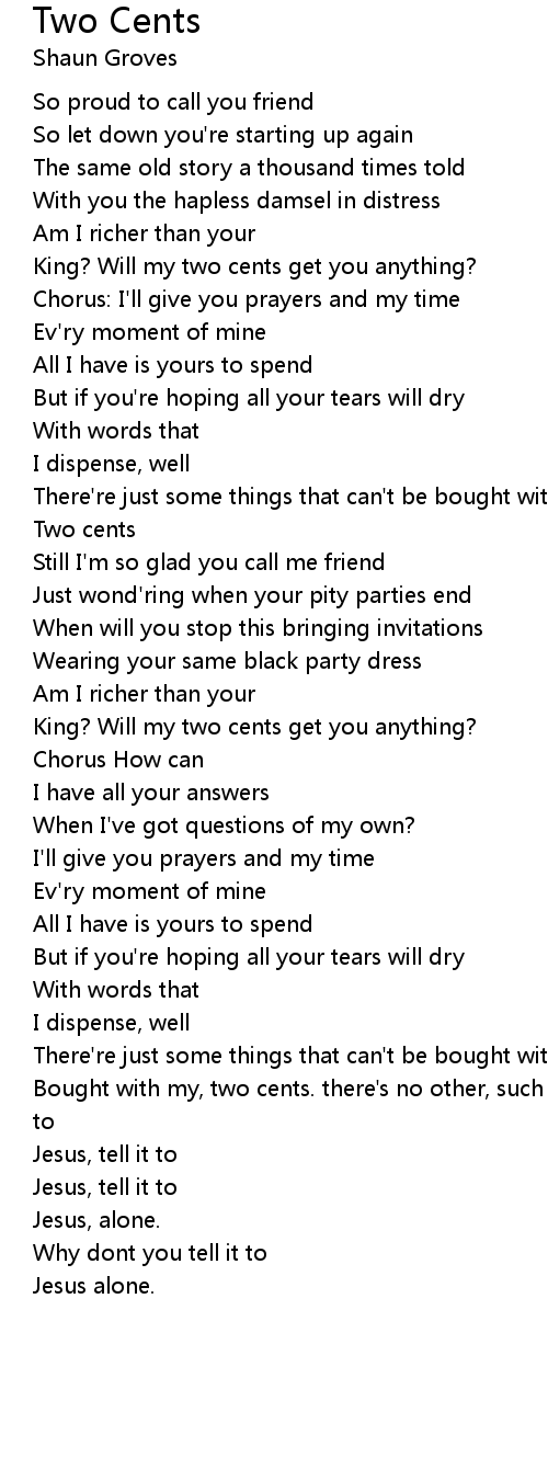 Bought with my, two cents. there's no other, such a friend and brother, tell it to |