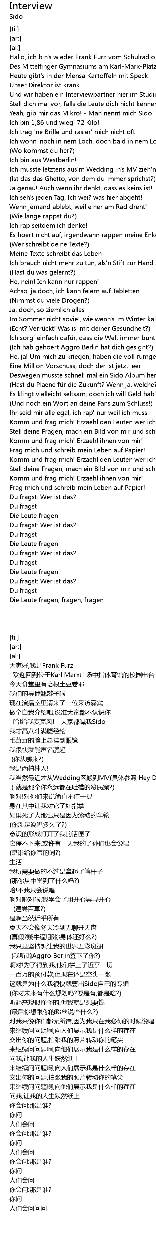 | [00:25.13] | Yeah, gib mir das Mikro! - Man nennt mich Sido |