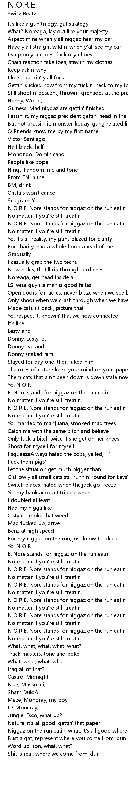 | N O R E, Nore stands for niggaz on the run eatin' | |