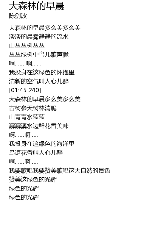 | [00:31.020] | 大森林的早晨多么美多么美 |