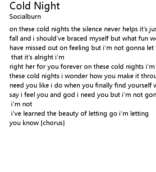 on these cold nights the silence never helps it's just a wake up call, a wake up fall and i should've braced myself but what fun would that have been i would have missed out on feeling but i'm not gonna let this faze me i've learned the beauty of letting go and i'm letting you know [chorus] that it's alright i'm right her for you forever on these cold nights i'm right here for you forever on these cold nights i wonder how you make it through does he hold you, and does he need you like i do when you finally find yourself will you have the strength to say i feel you and god i need you but i'm not gonna let this phase me cause i've learned the beauty of letting go but i'm still letting you know [chorus] i'm not gonna let this phase me [x3] i've learned the beauty of letting go i'm letting you know [chorus] |