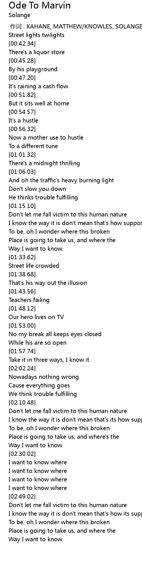 | [00:00.00] | 作词 : KAHANE, MATTHEW/KNOWLES, SOLANGE/RIDDICK, MAKEBA |