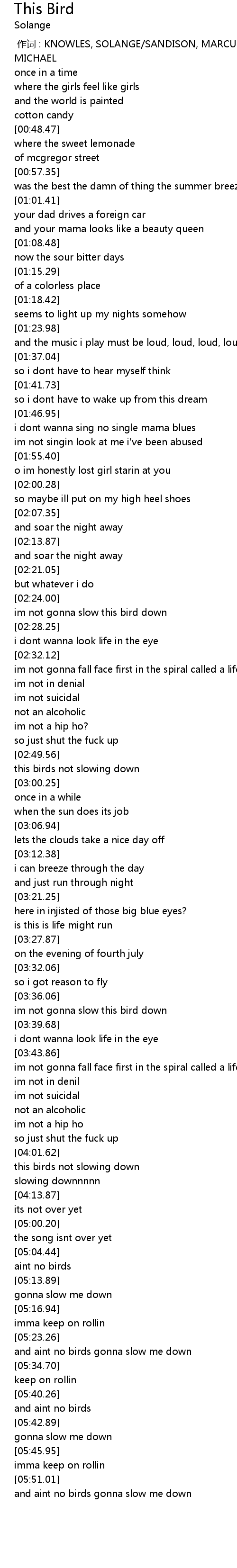 | [00:00.00] | 作词 : KNOWLES, SOLANGE/SANDISON, MARCUS(EOIN,MARCUS)/SANDISON, MICHAEL |