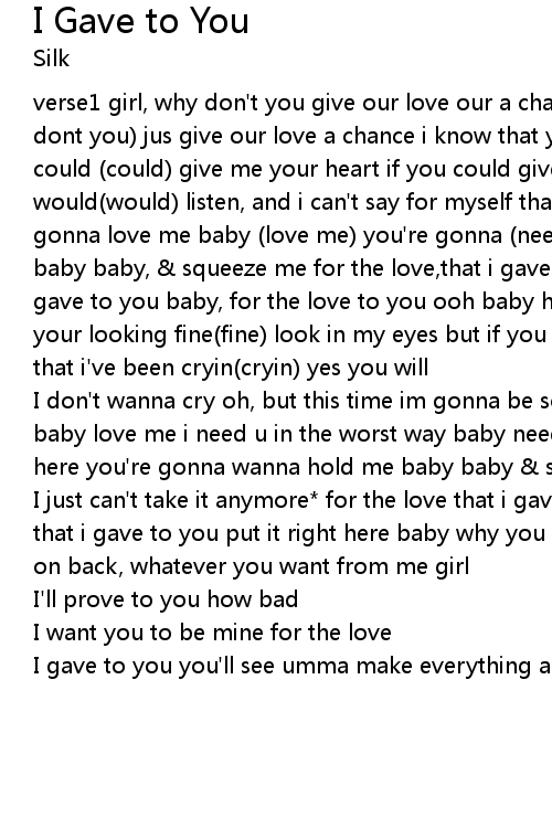 verse1 girl, why don't you give our love our a chance girl, why don't you (why dont you) jus give our love a chance i know that you done the best that you could (could) give me your heart if you could give me ur heart i know that you would(would) listen, and i can't say for myself that i been good but oh you're gonna love me baby (love me) you're gonna (need me) you're gonna wanna (hold me) baby baby, & squeeze me for the love,that i gave to you baby for the love that i gave to you baby, for the love to you ooh baby hey baby verse2 and i must admit your looking fine(fine) look in my eyes but if you look in my eyes you'll know that i've been cryin(cryin) yes you will