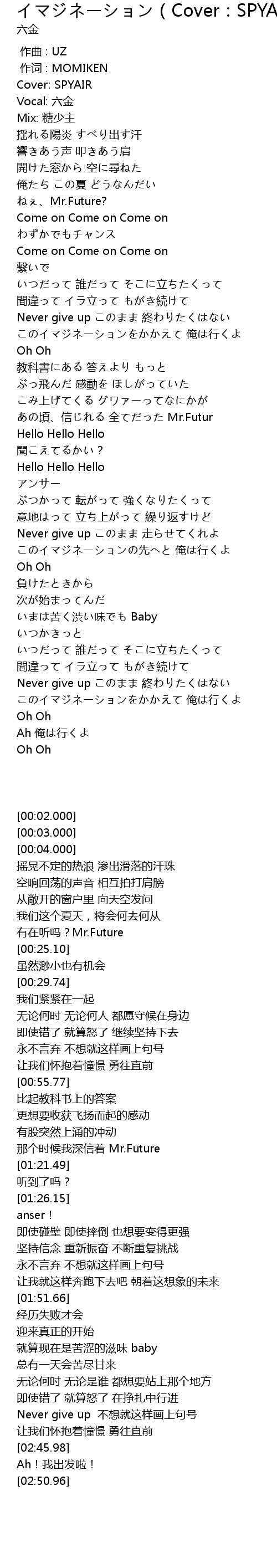 | [01:45.66] | このイマジネーションの先へと 俺は行くよ |