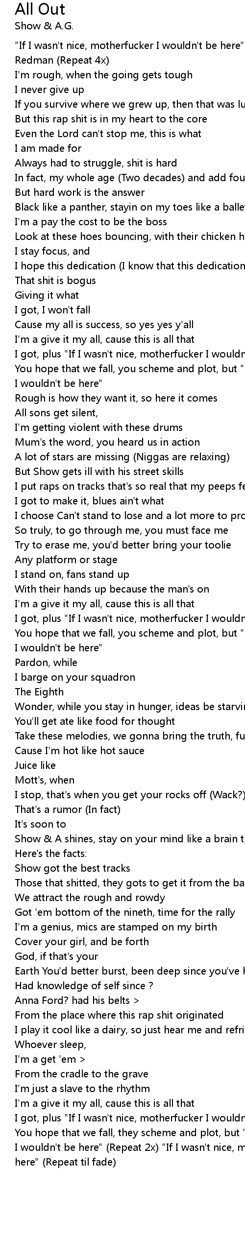 You hope that we fall, they scheme and plot, but "If I wasn't nice, motherfucker I wouldn't be here" (Repeat 2x) "If I wasn't nice, motherfucker I wouldn't be here" (Repeat til fade) |