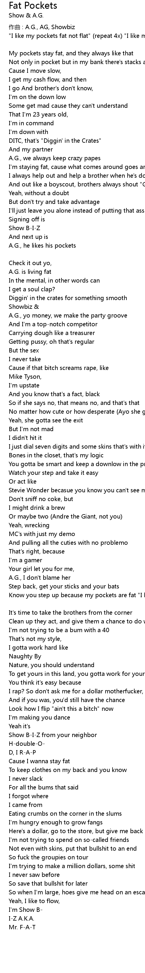 | Know you step up because my pockets are fat "I like my pockets fat not flat" (repeat 3x) [Showbiz] | |