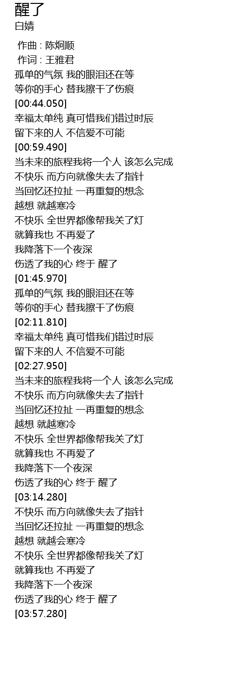 | [03:51.330] | 伤透了我的心 终于 醒了 |