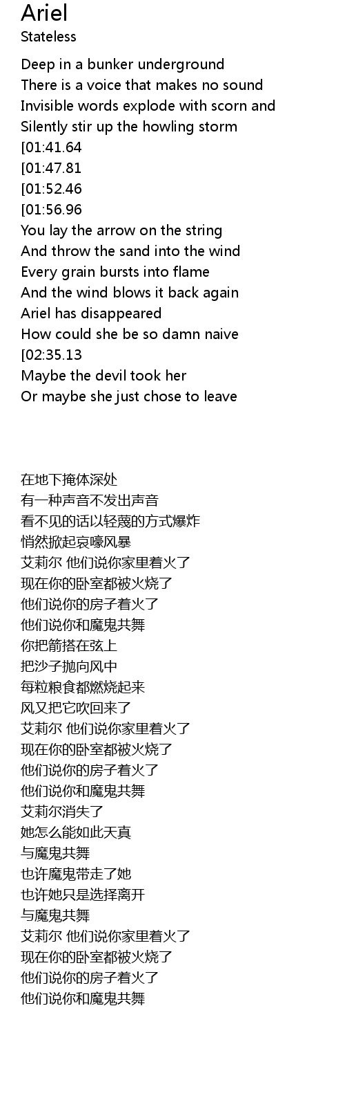 | [00:52.60][01:41.64][02:37.41] | Ariel there was a fire in your house they say |