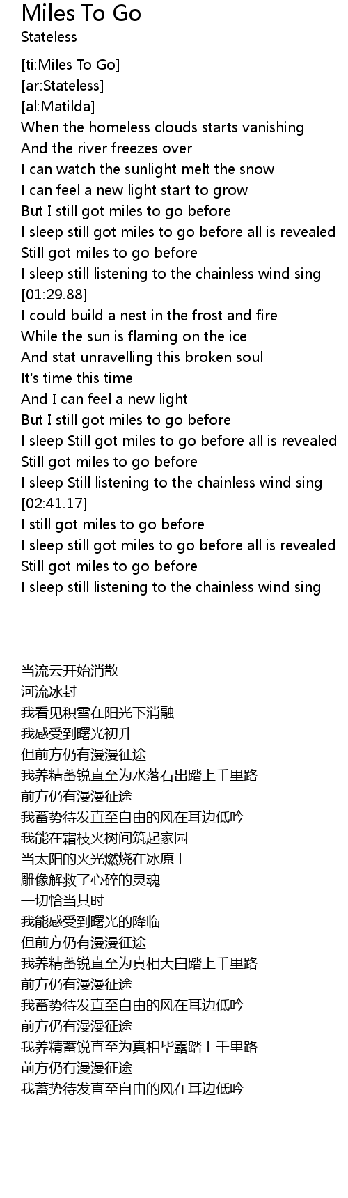 | [02:17.33] | I sleep Still got miles to go before all is revealed |