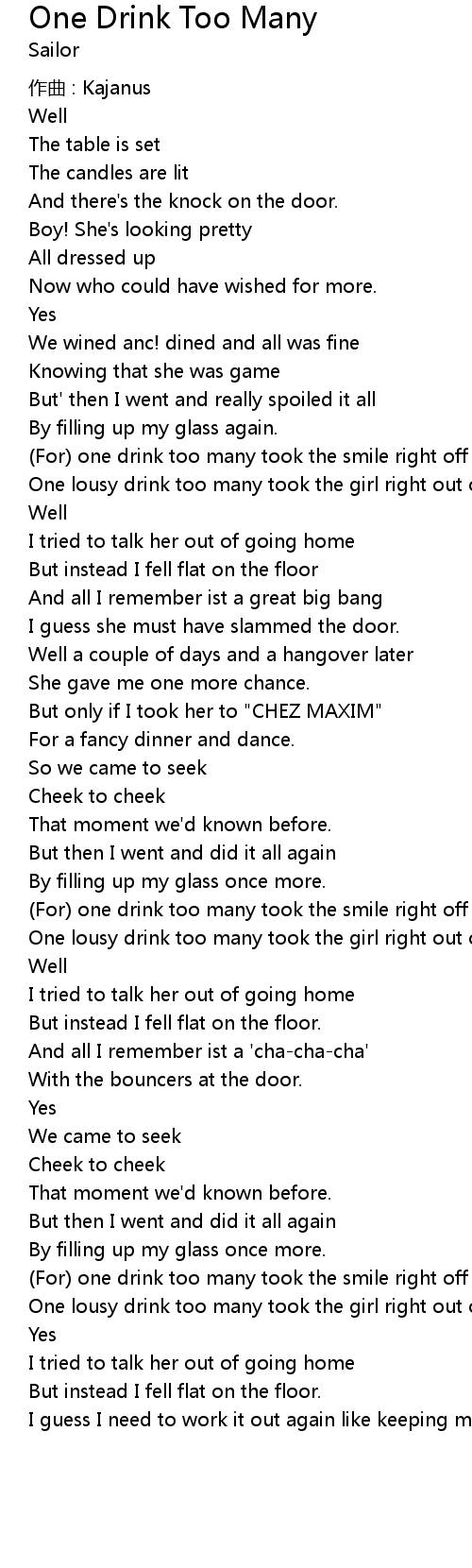 | Song | One Drink Too Many |