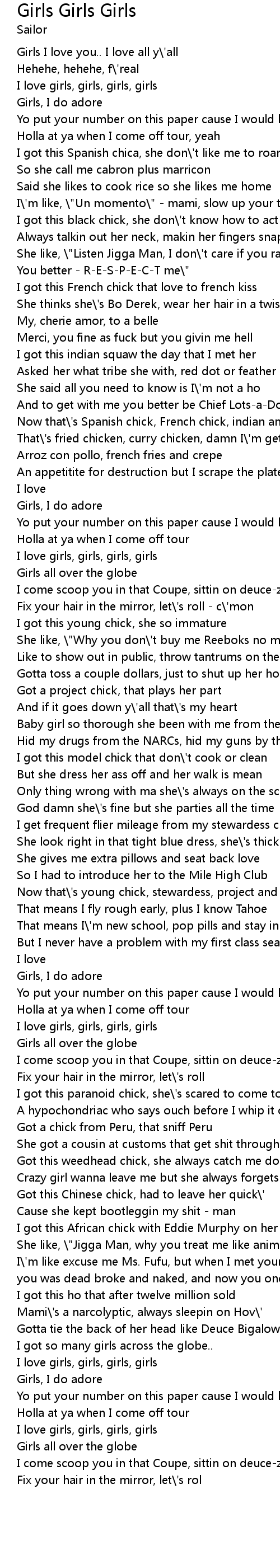 | [01:11.23] | Now that\'s Spanish chick, French chick, indian and black |