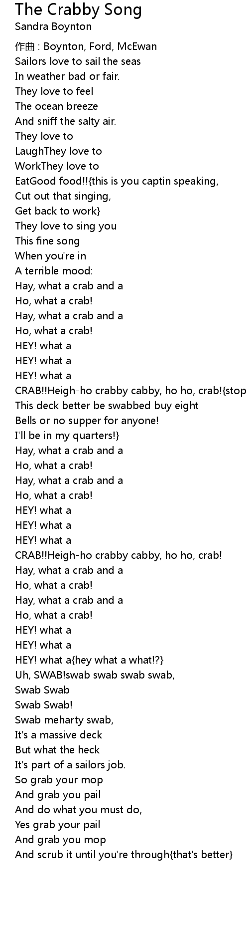| CRAB!!Heigh-ho crabby cabby, ho ho, crab!{stop that blasted music! | |