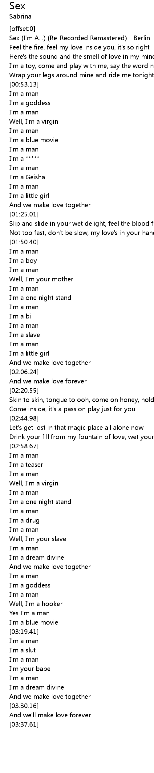 | [00:01.27] | Sex (I'm A...) (Re-Recorded Remastered) - Berlin |