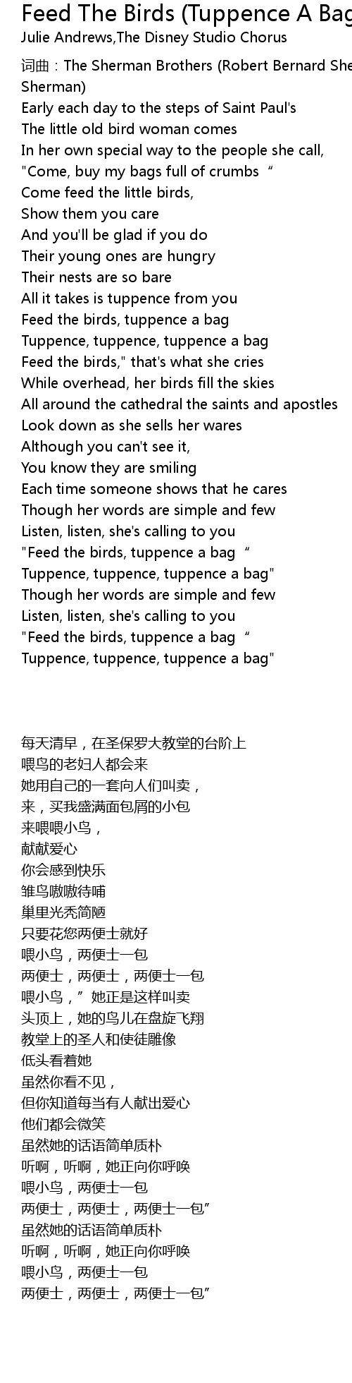 | [00:58.95] | Feed the birds, tuppence a bag |
