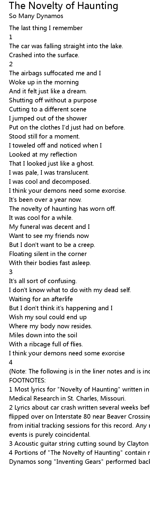 1 Most lyrics for "Novelty of Haunting" written in the smoking room at Gateway Medical Research in St. Charles, Missouri. |