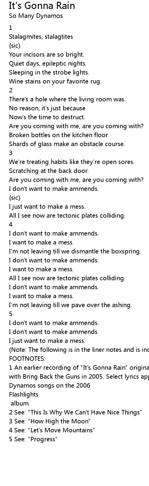1 An earlier recording of "It's Gonna Rain" originally appeared on a split 7" with Bring Back the Guns in 2005. Select lyrics appeared in other So Many Dynamos songs on the 2006