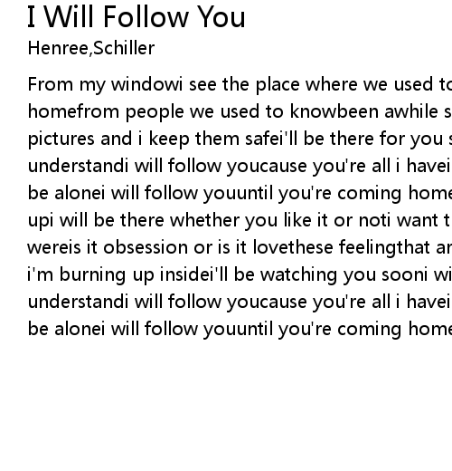 | From my windowi see the place where we used to gowent by there on our way homefrom people we used to knowbeen awhile since i've seen your facei've got pictures and i keep them safei'll be there for you sooni will follow youhope you understandi will follow youcause you're all i havei will follow youand you won't be alonei will follow youuntil you're coming home... homei'm not gonna give you upi will be there whether you like it or noti want things to be the way they wereis it obsession or is it lovethese feelingthat are hard to hideit feels like i'm burning up insidei'll be watching you sooni will follow youhope you understandi will follow youcause you're all i havei will follow youand you won't be alonei will follow youuntil you're coming homei want you nowi want you now |